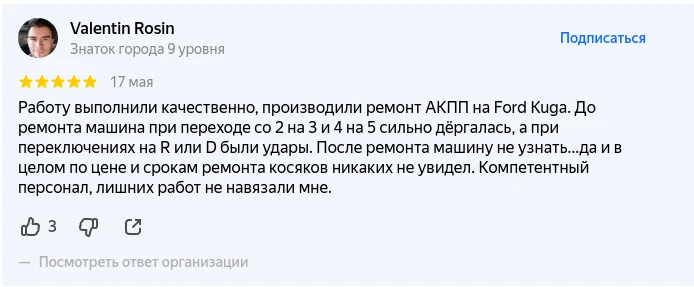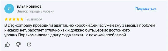 Приезжал сюда дважды на диагностику после адаптации у официалов, где мне пророчили полную замену мехатроника и сцепления. Здесь сказали что основная проблема в гидравлике и сцеплении и что не нужно полностью менять Мехатроник а можно его починить и на этом сэкономить. Прислушался к совету мастера, который в итоге оказался прав. Получилось дешевле в несколько раз чем то к чему готовился заранее. Спасибо большое вашему коллективу за профессионализм и быстрый ремонт. Буду вас рекомендовать как грамотных специалистов.